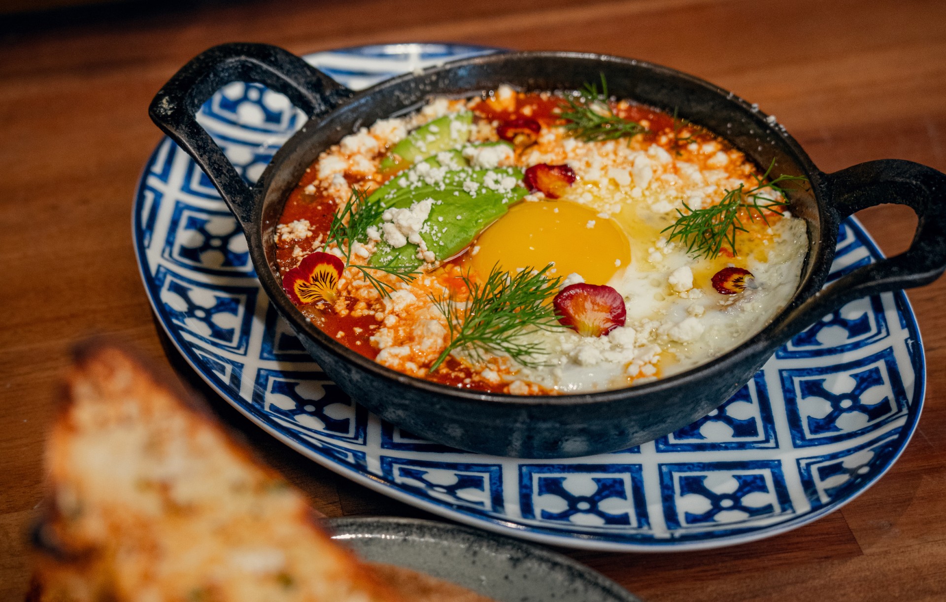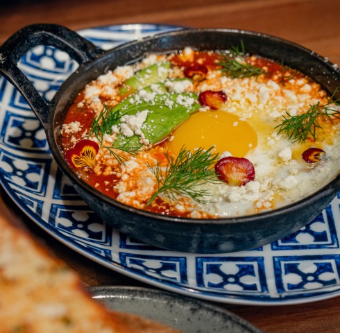 Shakshukaharissa & tomato sauce, eggs, avocado, feta, sweet peppers & onions |